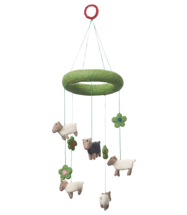 Das Mobile Bää mit seinen fliegenden Schäfchen ist ein Zierde über jedem Babybettchen. Unter der Kontrolle von Klippans Yllefabrik von nepalesichen Hausfrauen liebevoll von Hand gefiltzt und genäht.