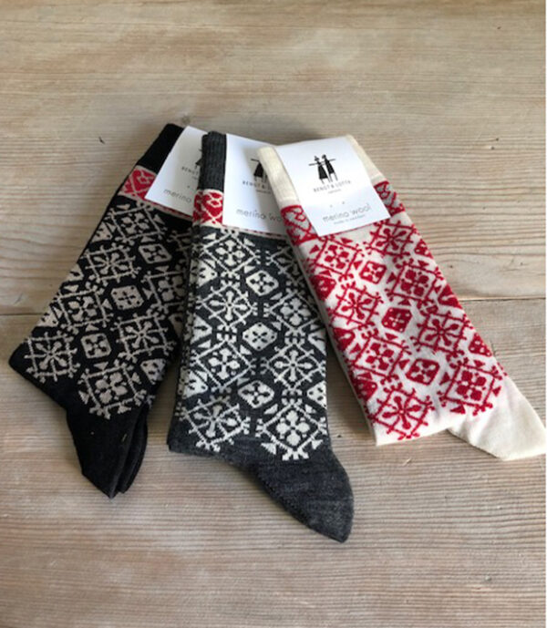 Die Socken mit den fröhlichen Mustern von Bengt & Lotta aus der Weberei Cai in Schweden sind bei jung und alt beliebt, ob zum Wandern, Tennisspielen oder einfach so als stylishes Accessoire und Geschenk. Der grosse Anteil an Merinowolle hält bei jeder Aktivität trocken und angenehm warm. Merinowolle ist ein natürlicher Wärmeregulator, so können die Socken sowohl im Sommer wie im Winter getragen werden. Zudem werden diese Socken auch wegen ihrer guten Strapazierfähigkeit und Langlebigkeit geschätzt. Ideal auch auf Reisen, da sich diese einfach von Hand auswaschen lassen und im Nu trocknen. Alle Muster gibt es in zwei Einheitsgrössen 35-39 und 40-45 und sind sowohl für Damen wie Herren geeignet.